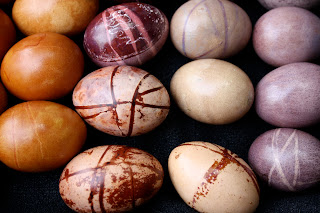 Some mark making supplies include rubber bands, nylon stockings for holding things in place, electrical or masking tape, beeswax & tjaunting tool, crayons, lace, fresh grasses, flowers and leaves or whatever else you can think of. Additional color variations can be achieved by varying the dyeing time. When an egg is placed in a dye solution, the dye bonds itself to the eggshell. When the dye is more concentrated or the egg is left to soak for a longer time, more dye bonds to the egg, resulting in a deeper color. Dyeing eggs with natural dyes usually requires extended soaking times.